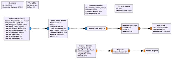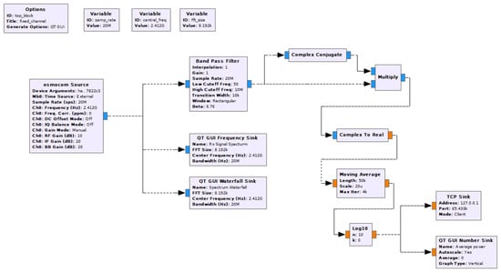 Notably, each block can be easily customized through parameters specific to its functionality. The GNU Radio implementation of the initial version of the RF measurement sub-system, which is depicted in Figure 3, consists of the source block—osmocom (or Soapy HackRF)—and several other processing and illustration blocks for the graphical user interface (GUI).