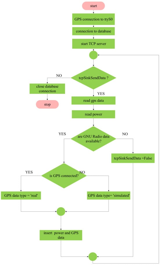 Upon establishing a connection with the TCP Sink, the Python application enters an infinite loop, wherein it continually reads the transmitted power values from GNU Radio using the command “data = conn.recv(4)”. Subsequently, these power values are stored in the database, alongside data originating from the GPS.