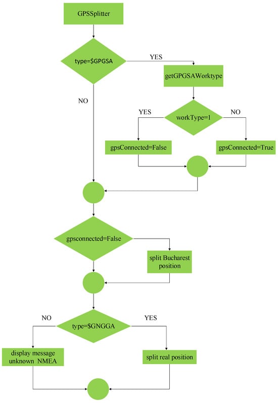 The GPS unit communicates with the application via the serial port, transmitting messages conforming to the NMEA standard. These messages are identified by codes commencing with a “$“ symbol. In this work, only two specific message types, namely GPGSA and GNGGA, were utilized. All pertinent values within each message type are extracted programmatically using the GPSSplitter class, which parses the messages based on comma separators. The resulting values are then stored within the respective class corresponding to the message type. To ascertain the specific data type received from the GPS module, the logical processes depicted in Figure 7 are adhered to.