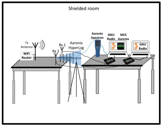 The log-periodic antenna was placed between the two Rx antennae, so that the distance between two adjacent antennae was approximately 20 cm. The distance between the Tx antenna and the receiving antennae was approximately 70 cm, thus placing the receiving antennae in the far-field region. The spectrum analyzer (SA) was connected to the same laptop as the initial RF unit configuration—the one connected to the Rx 1 antenna.