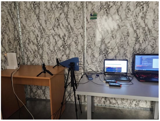 As noted in the diagram illustrated in Figure 8 and the image in Figure 9, the generator unit and the Rx antennae are placed on the left-side table, whereas on the right-side table, there are the RF receivers, the spectrum analyzer, and two laptops.