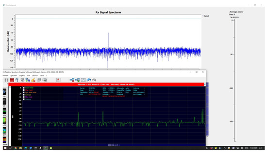 The outcome, as provided by the QT GUI Frequency Sink block (in Figure 3), delineated the Wi-Fi signal spectrum within the band corresponding to the operational channel. These outcomes were subsequently juxtaposed with the signal spectrum acquired through the SA. Figure 10 serves to illustrate a comparative analysis of the spectra obtained from these two devices—the SA, positioned at the lower section of the image, and the SDR device configured in its initial state, specifically the fixed channel configuration.