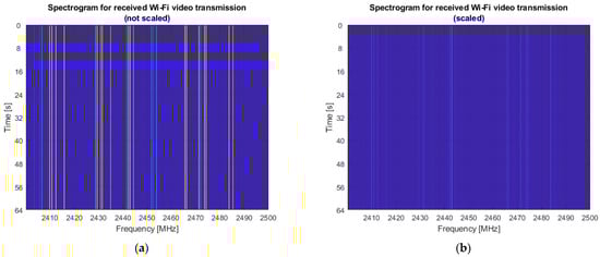 Spectrogram results for the full-band (auto-channel) Wi-Fi video transmission: (a) not scaled; (b) scaled with the absolute maximum value.
