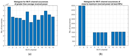 Histograms for the Wi-Fi channel occurrences regarding the channel power: (a) higher than the average received power; (b) being at least 90% of the maximum received power.
