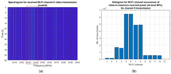 The second scenario had the Wi-Fi router prioritizing channel 6 for the video transmission. Indeed, in this case, both the spectrogram and histogram presented in Figure 13 show that most of the Wi-Fi signal power was received for frequencies within channel 6 (2426–2448 MHz). The spectrogram highlights the 2430–2440 MHz band.