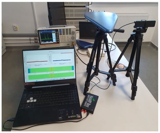 - A reference measurement device represented by a spectrum analyzer (SA)—Aaronia Spectran 6080-V4, which operates in the 10 MHz–8 GHz band, and a receiving log-periodic directional antenna Aaronia HyperLog 7025, with a 5 dB gain. The spectrum analyzer is connected to a laptop with dedicated software (Aaronia MCS Spectrum Analyzer Software 2.1.6.
