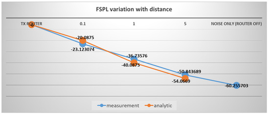 Subsequently, the system’s performance was assessed in terms of the variation in the average power within the channel at different distances from the source. Three specific distances, namely 0.1 m, 1 m, and 5 m, were employed for this analysis. The measurements were compared to the analytical results provided by the free-space path loss (FSPL) parameter, computed with the following relation []: