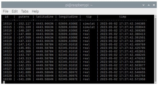 In Figure 17, a segment of the database content is presented. Within this illustration, the “id” field serves as the primary database key, the “putere” (power) field signifies the channel’s average power as measured by the RF unit, and the subsequent “latitudine” and “longitudine” fields denote the geographical coordinates furnished by the GPS unit. Additionally, the “tip” field distinguishes whether the location was directly measured or replaced with a default value (representing the central geographical position of Bucharest) in instances of poor GPS reception, primarily attributed to adverse weather conditions. Lastly, the “timp” field corresponds to the timestamp associated with the measurements.