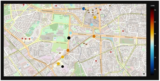 The results of the portable system with the implementation of the initial configuration can be used to create an electromagnetic field profile map depending on the geographical coordinates. A typical result illustrating the average measured power is depicted in Figure 18. The data were obtained using the initial configuration of the RF unit, with in situ measurements in a single Wi-Fi channel with bandwidth 20 MHz. The level is color-coded, with the scale represented on the right side of the map.