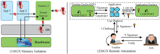 - Memory Isolation. When a program runs on the SGX-enabled platform, it is divided into two parts: an untrusted storage region and a trusted isolated region (enclave). An enclave is a separate block of physical RAM that cannot be accessed by other applications, privileged software, OS, hypervisor, or the firmware on the system in Figure 1(1). Meanwhile, the enclave is used to protect sensitive data and codes. When an SGX program is hung or closed, the untrusted storage region mainly is utilized to store the encrypted sensitive data separated from the enclave.