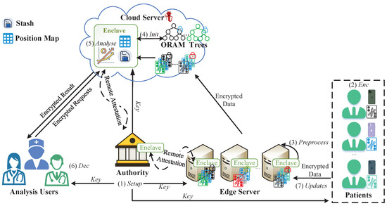 As shown in Figure 2, SEDASGX consists of five entities (i.e., analysis users (), patients (), edge server (), cloud server (), and authority ()), and their respective tasks are described as follows.