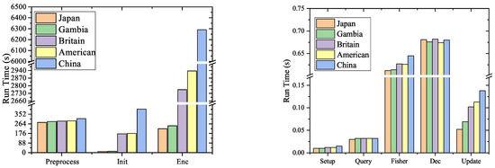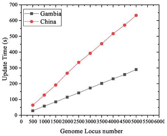 Figure 5 shows the comparison of the update time of the two edge servers with the largest and smallest data volumes. The update cost of edge servers owned by China is higher than the update cost of edge servers owned by The Gambia. Through comparison, the update efficiency is not only related to the amount of original data but also related to the number of update gene loci. Notice: The content presented in Figure 5 is the update cost for a small number of loci on a chromosome. We only want to reflect the relationship between the update cost and the number of updated gene loci according to Figure 5. Our scheme is built based on real genetic datasets, so the framework of the scheme is easily scalable to handle massive genetic loci.
