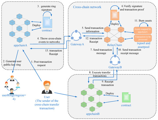 This section primarily focuses on the process of transferring and declaring assets from appchainA to appchainB. To illustrate this, we consider two different highly secure blockchain systems. In this scenario, a user on appchainA intends to send a transfer transaction to a user on appchainB. Even though these two blockchain systems may lack interoperability, they possess a high degree of trustworthiness. In this paper, we propose a cross-chain asset transaction method that ensures user identity privacy by leveraging the solid design of the two trustworthy blockchain systems. The solution utilizes relay chain cross-chain technology and introduces ring signature technology to protect the transaction initiator’s identity privacy. The specific framework flow of this method is presented in Figure 2.
