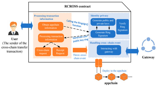 In this paper, a cross-chain contract is designed to achieve identity privacy protection using the ring signature algorithm. The RCROSS contract consists of three main modules: the transaction-information-processing module, the identity privacy protection module, and the cross-chain event-processing module. Deploying the RCROSS contract on the appchain enables the timely processing of cross-chain transaction requests while ensuring privacy protection relative to personal account information. The design framework of the RCROSS contract is depicted in Figure 3.