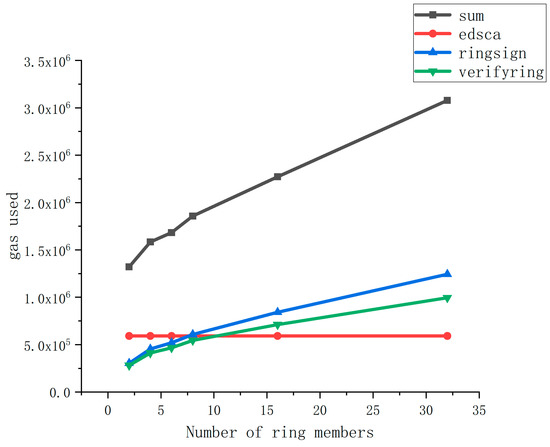We conducted tests to determine the consumed gas when using a ring signature function with varying ring member numbers (specifically, 2, 4, 6, 8, 16, and 32). As the ring signature algorithm employed in this scheme is based on elliptic curve designs, our test metrics included the gas consumed by the curve, the gas consumed during ring signature generation, and the gas consumed during ring signature verification.