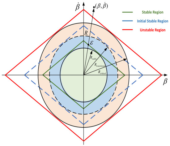 based on Equation (41) and control both the maneuverability and stability of the vehicle. This method allows for different control strategies based on the vehicle position relative to the stable and unstable region boundaries, ensuring appropriate intervention to maintain both maneuverability and stability.