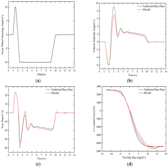 in sideslip angle, and based on that, a GFT-SMC controller was designed. At the same time, to improve the control performance, we considered tire characteristics, by dividing the lateral force into linear, nonlinear, and saturation regions, dividing the phase plane into stable, transitional, and unstable regions, indirectly combining the vehicle’s maneuverability and stability with tire force, thereby achieving coupling and decoupling of the vehicle’s maneuverability and stability control.