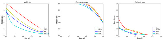 As shown in Figure 6, the PR graphs for static (Drivable) and dynamic elements (vehicle, Pedestrian, Large vehicle, Bicycle, Bus, Trailer, Motorcycle), which are obtained by adjusting different confidence thresholds, and different points on the coordinate system represent different recall and precision.