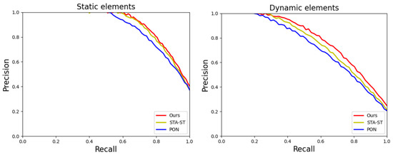 The P–R curve is an important tool for evaluating the performance of a model, and by finding a balance between recall and precision, a more comprehensive understanding of the model’s performance can be obtained. In the context of intelligent transportation, we are particularly interested in dynamic temporal prediction, the ability to accurately predict targets in motion in a traffic scenario. For a given recall, a higher detection accuracy means that the model is more accurate to the target while maintaining a high recall. In this experimental comparative analysis, we can clearly observe the performance of our method on the P–R curve. Our method is not only able to achieve a high recall, but also achieves superior detection accuracy at the corresponding recall. This suggests that our algorithm represents a better result for a given recall setting in terms of dynamic timing prediction.