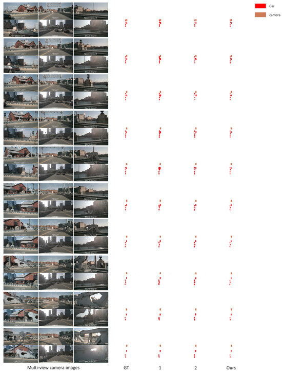 In this section, as shown in Table 2, we use ablation study to evaluate the effectiveness and robustness of our proposed BEV (Bird’s Eye View) method for intelligent transportation applications. We compare our method with four other methods, namely: 1 (looking up): this method uses a simple perspective transformation to transform the image from front view to top view, and then uses a pre-trained CNN to perform semantic segmentation and object detection; 2 (looking both ways): this method uses a bi-directional perspective transformation to transform the image from front view and side view to top view, and then uses a pre-trained CNN to perform semantic segmentation and object detection; 3 (BEV-plane): this method uses a plane-based BEV generation method to transform the image from front view to top view, and then uses a pre-trained CNN to perform semantic segmentation and object detection; 4 (both-planes): this method uses a plane-and-curve-based BEV generation method to transform the image from front view and side view to top view, and then uses a pre-trained CNN to perform semantic segmentation and object detection.