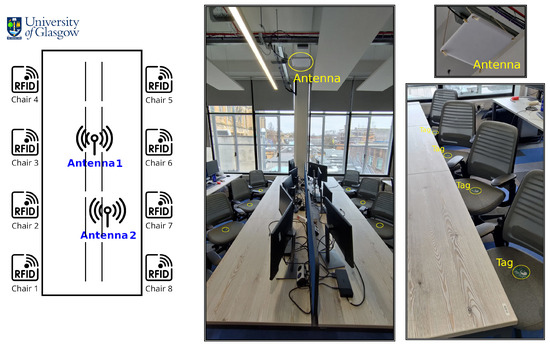 In this paper, the concept of backscatter localization, combined with machine learning algorithms, was employed for tracking the position of chairs. More specifically, this study concentrated on evaluating the Received Signal Strength Indicator (RSSI) and phase angle in a controlled, work-like environment. A testbed was constructed, featuring eight chairs arranged around a desk. Figure 1 depicts these chairs around the desk, each positioned corresponding to its number (for example, chair 1 is at position 1). The setup included two ultra-high-frequency (UHF) antennas, with one situated at the desk’s centre and the other placed to one side. The desk was located in a low-traffic but actively used area and outfitted with multiple monitors. This location choice facilitated the evaluation of the machine learning model in conditions that closely resemble those of a high-traffic real-world environment.