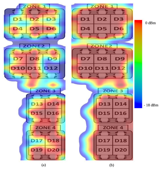 Shown in Figure 2a,b is a heat map of the whole room area, where zones 3 and 4 combine to be the test location for our localisation experiment. Figure 2a shows the energy levels using an omnidirectional antenna, and Figure 2b shows the unidirectional UHF antenna. All readings were taken on the desks or the arm of a chair for positions between desks. The antennas were positioned 218 cm above the desk (one antenna was set at a height of 208 cm due to the room structure, which would have blocked it at the full height), and the chairs were positioned a further 20 cm down.