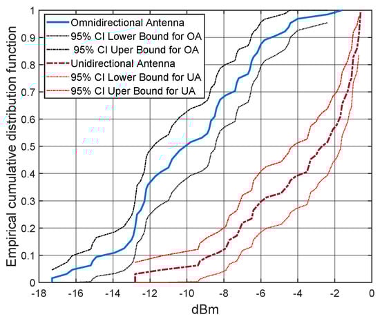Comparative CDF of the received power from the RFID signal for each antenna.