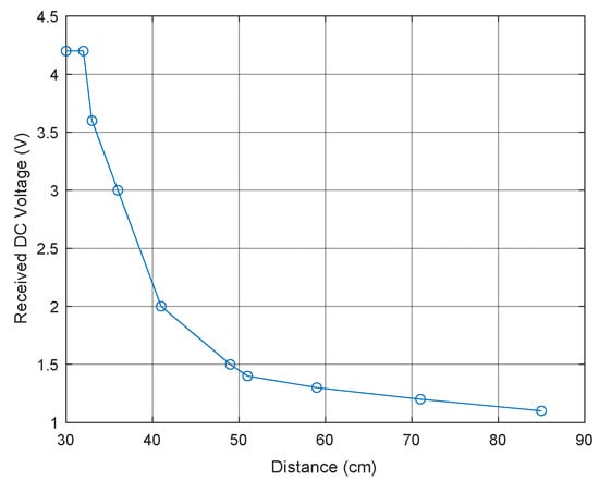 These transmitters radiate over 30 dBm of equivalent isotropic radiated power (EIRP). In our testing, we were able to harvest this at a consistent 1 V or higher at up to an 85 cm distance, using the same antenna on a Powercast P210-EVB Powerharvester. Figure 4 shows the sustainable DC voltage that was able to be harvested compared with the distance between the transmitting antenna and the harvester receiving antenna; 4.2 V is the maximum that the Powercast board can output.