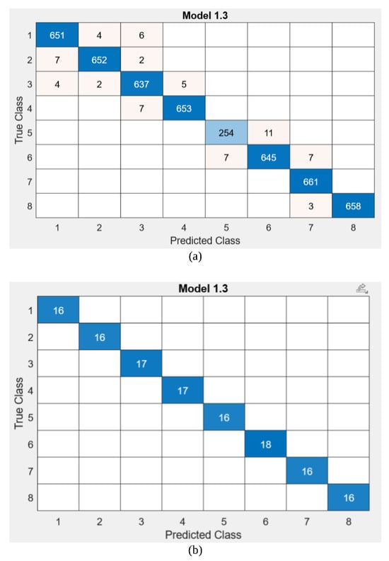 Confusion matrix of the RFID-based localisation using two reader antennas (a) vs. three reader antennas (b).