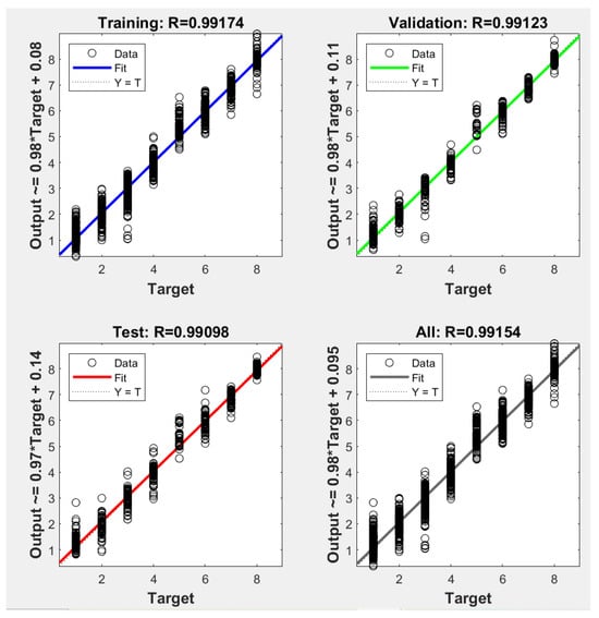 Figure 7 displays regression plots used for statistical analysis to examine the relationship between the output and target variable. The data points show the actual observations, while the fitting line represents the predicted values. The R score is the correlation coefficient, which indicates the relation between the predicted and target values. On the Y-axis of each plot, you can find an equation (e.g., Output = 0.987 × Target + 0.08) that represents the linear regression equation fitted to the data, where the coefficient (0.987) is the slope and the constant term (e.g., 0.08) is the intercept. This equation is derived from model training, and the correlation coefficient R is a statistical measure that determines the strength and direction of a linear relationship between two variables. The R scores of training, validation, and test are almost identical and close to 1, indicating that the model does not suffer from overfitting.