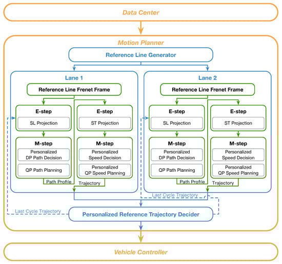 Therefore, this study adopts the EM framework of the Baidu Apollo EM motion planner (EM planner for short) [], a path-speed decoupled method, with personalized customizations on path optimization, speed optimization, and reference trajectory decision making, as shown in Figure 1. The data center module provides all needed information, including localization, perception, prediction, high-definition (HD) map, and route information for the motion planner. In the motion planner, the candidate reference lines along lanes are generated within traffic regulations based on the HD map and navigation information. Then, lane-level motion planning is carried out in parallel for every candidate lane to produce the lane-level best trajectory. During the lane-level motion planning, a Frenet frame is first constructed based on that lane’s reference line. Then, path optimization and speed optimization, which both consist of an E-step and an M-step, are performed in the Frenet frame and the station-time coordinate system, respectively. During the path optimization, information about the ego vehicle and traffic participants is projected on the station-lateral plane (SL Projection), and a smooth path is generated through a path optimizer consisting of dynamic programming (DP) path decision and quadratic programming (QP) path planning. During the speed optimization, information about obstacles is projected on the station-time plane (ST projection), following which a personalized speed optimizer consisting of speed decision and QP path planning generates a smooth speed profile. By combining the path and speed profiles, the best trajectory for every candidate lane is obtained. Finally, the personalized reference trajectory decider selects a reference trajectory among the trajectories of candidate lanes according to the driver’s preference, the cost of trajectories, and traffic regulations, and transfers it to the vehicle controller.