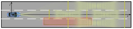 where is the DP path; describes the distance to the DP path; and , , and are related to the smoothness of f. The objective functional describes the balance between obstacle avoidance and smoothness. Additionally, the linear constraints include tunnel boundary constraints and smoothness constraints. The tunnel boundary constraints require that the bounding box of the ego vehicle is constrained within the feasible tunnel, which reduces the search space and ensures the convexity of QP. The smoothness constraints require that the polynomials of the smoothing spline are joined at spline knots with up to m-th order derivative matching.