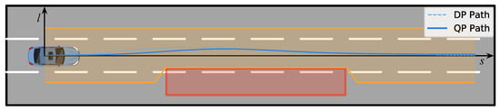 By solving the QP problem, a smooth path is obtained, as shown in Figure 5. The solid blue line is the QP path, while the DP path is represented by the dashed blue line. The orange region depicts the feasible tunnel.