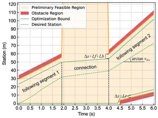 Once the station coordinates of the ego vehicle’s bounding box intersect those of the obstacles’ bounding box given a specific time, the overlap regions will be marked on the station-lateral plane, e.g., the red region in Figure 3.