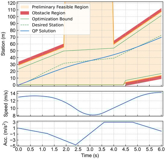 where denotes the desired clearance; v is the speed of the ego vehicle; and the constant coefficients a, b, and c are identified by the least square method. Based on the QDC model, the personalized speed decision-making algorithm, as summarized in Algorithm 1, is proposed to provide a reference speed profile for personalized QP speed planning. First, with all the needed information about the ego vehicle and obstacles transferred from the data center, we calculate the predicted relative lateral distance between the ego vehicle and each obstacle. Second, the speed profiles of the preceding obstacles are extracted to mark the obstacle regions and the preliminary feasible region in the station-time plane as the red regions and the orange region shown in Figure 6, respectively. Next, given the dimensions of the ego vehicle and the minimum safety clearance (2 m in this study, less than which is considered a collision), the upper and lower bounds for a speed profile in each following segment can be calculated. The final bounds are obtained by connecting the bounds of the adjacent segments, as represented by the solid green lines in Figure 6. Finally, the personalized speed decision is calculated by subtracting the desired clearance from the upper bound while satisfying , as represented by the dashed green line in Figure 6.