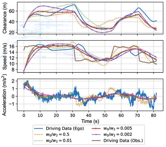 However, the limitation of this study is that the driving behaviors in the human driving data used to build the personalized motion planner were assumed to be appropriate. Meanwhile, the behavior of drivers, especially novice drivers, may occasionally cause safety concerns or disrupt traffic flow. Although our approach imposes safety constraints on the motion planner and considers the lateral intentions of the surrounding vehicles, the human driving data with inappropriate driving behaviors should be filtered out in advance, which is related to the field of driving behavior analysis []. In addition, for situations where a novice driver lacks driving data, the personalized reference trajectory decider cannot make a personalized decision. However, thanks to the interpretability of the BN, such situations can be identified when they happen because there is no corresponding probability at the leaves of the probability tree. Additionally, the decisions made by another BN built with all available driving data (including data of other drivers) should be adopted, or the decisions can be made based on trajectory safety assessment and traffic regulations. Finally, the driver’s behavior can be influenced by the external conditions, e.g., icy road and fog. Benefitting from the interpretability of the proposed method, adaptive strategies can be developed to handle different external conditions. For example, the desired clearance calculated by Equation (8) can be multiplied by a factor to increase the clearance to the preceding vehicle when the road is icy. Alternatively, different personalized motion planners can be developed for different external conditions if corresponding human driving data are sufficient.