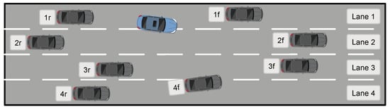 Next, and are expanded for similar reasons. Then, the lateral intentions of the interested surrounding vehicles (ISVs) are expanded successively. Here, the ISVs are determined by analyzing the traffic scenario. For simplicity, a scenario of a highway with four lanes is used for explanation, as shown in Figure 10. First, only the two closest vehicles ahead and behind in each lane (the vehicles labeled as “f” and “r”) need to be considered. One reason for ignoring the vehicles farther away in front is that they generally do not directly interact with the ego vehicle. Another important reason is that considering those vehicles will make the structure of the BN much more complex, which hinders its application. In addition, there is no additional threshold to exclude vehicles that are very far because it may vary from one driver to another. Algorithm 4, presented later in this paper, can automatically partition the distance variable of an obstacle vehicle according to its effect on the ego lateral intentions. In this way, the algorithm equivalently finds the distance threshold beyond which the vehicles will not affect the ego lateral intentions.
