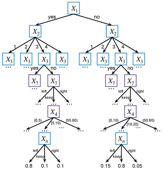 For building a probability tree, three core tasks need to be completed: (1) determining the discrete and continuous variables to be expanded, (2) determining the expanding order of the variables, and (3) determining where to partition and how many intervals to partition into for continuous variables. The proposed algorithm expands discrete variables preferentially in general. is first expanded because whether the ego vehicle reaches the driver’s desired speed may influence the driver’s lateral decision in any traffic situation, as depicted in Figure 11.