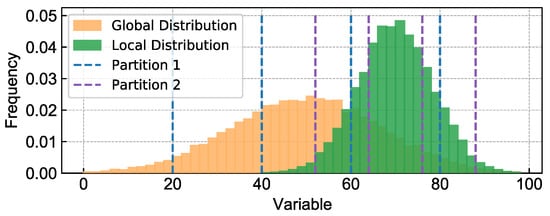 In Algorithm 4, the first step for discretizing a variable at a branch b is to find its local minimum and maximum values in the subset of whose samples are on the , instead of global minimum and maximum values in . This can contribute to retaining more information when variables are partitioned into intervals. For example, assuming that the ranges of a variable in and the subset are and , respectively, discretization with partition 2 contains more information about the local distribution than with partition 1, as shown in Figure 12.