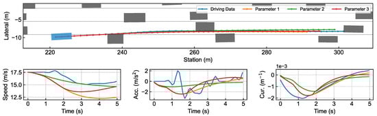 In addition, the acceleration of the planned longitudinal motion monotonously increases as r increases due to the nature of the smoothing spline []. Therefore, r is assumed to be linear, quadratic, and logarithmic functions of successively, whose parameters can be obtained by Bayesian optimization []. Since the amount of collected data is small, LOOCV is employed to evaluate the hypothesis models. The proposed algorithm for obtaining r is summarized in Algorithm 2, where denotes the number of episodes of driving data, and denotes the number of folds of LOOCV. Each episode contains the trajectories of the ego vehicle and obstacles, and the car-following episode refers to the episode in which the driver of the ego vehicle performs no other behavior except car following.