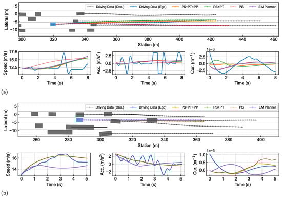The simulated trajectories, speed, acceleration, and curvature of the ego vehicle in representative lane-changing and lane-keeping scenarios: (a) the lane-changing scenario; (b) the lane-keeping scenario.