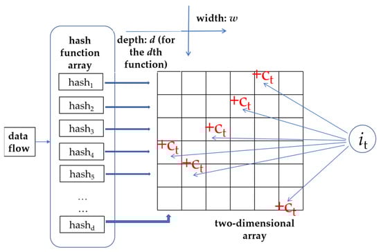 At present, with the increasing network traffic, the Sketch algorithm is widely used in data flow mining algorithms, and the demand for Sketch algorithm performance is also increasing. Among various Sketch algorithm structures, Count-min Sketch [26] proposed in 2004 has better performance. In recent years, most data flow mining algorithms based on the Sketch algorithm have been improved based on Count-min Sketch. It randomly projects high-dimension traffic data to low-dimension space, which is a typical compression mapping. The Count-Min Sketch algorithm is composed of a two-dimensional array with a width of w and a depth of d. Each element of the array corresponds to a counter, that is, counter [1,1], …, counter [d, w]. Each counter value of the array is initialized to 0. The Count-Min Sketch algorithm uses hash mapping rules to map elements in a data stream to the corresponding counter in each row for counting. The Count-min Sketch algorithm has the characteristics of fast update and query speed, high-speed arrival of data flow, and fast processing [27,28]. Figure 1 shows the summary method of the Sketch data stream processing method of the Count-min Sketch algorithm. The specific algorithm process is as follows.