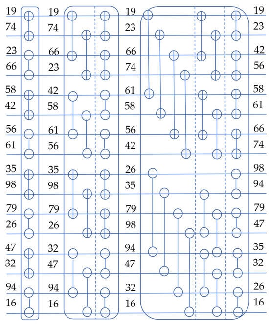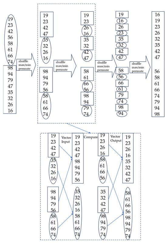 Bitonic sorting is a sorting method based on the Batcher theorem [31]. Any bitonic sequence A with a length of 2 n is divided into X and Y of equal length. The elements in X are compared with the elements in Y one by one in the original order, that is, a [i] is compared with a [i + n] (i < n). The larger one is put into sequence M, and the smaller one is put into sequence N. Then, the obtained sequences M and N are still bitonic sequences, and any element in the sequence M is not less than that in the sequence N. According to this principle, sequences M and N can be obtained by shuffling and comparing from a bitonic sequence with 2 n elements, and then an ordered sequence can be obtained by processing two n-order bitonic mergers. Figure 2 shows the bitonic sorting diagram.