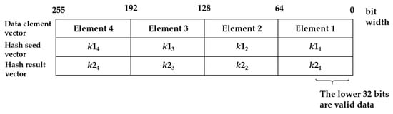 - Construct the vector: according to the initial value of each hash function, use the instruction _mm256_set_epi32 to construct the hash result vector. According to the seeds of each hash function, a hash seed vector is constructed. For the data stream to be processed, use instruction _mm256_set1_epi32 to make four copies and construct the data element vector. Because the effective bit width of each seed, hash result, and data element is 32-bit, the actual bit width of these values in the vector is 64-bit to prevent multiplication transgression. The composition structure of each vector is shown in Figure 5.