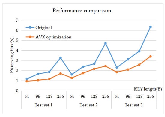 The following conclusions can be drawn from Table 2. Taking the test results of data set 3 as an example, in terms of hash operation, when the length of KEY is 128 bytes, the running time of sketch decreases from 3,917,605 us in the original version to 2,576,302 us in the optimized version, and the time consumed by the AVX-optimized version is 65.8% of the original version. When the length of KEY is short, the instructions consumed by multiple hash functions account for less in the whole process. For example, when the length of KEY is 96 bytes, the running time is reduced from 3,109,784 us to 2,089,397 us, and the time consumed by the AVX-optimized version is about 67.2% of the original version. As the length of KEY gradually increases, the proportion of instructions consumed by multiple hash functions in the whole Sketch also gradually increases. For example, when the length of KEY is 256 bytes, the running time is reduced from 6,321,628 us to 3,399,399 us, and the time consumed by the AVX-optimized version is reduced to 53.8% of the original version. Figure 6 gives the performance comparison of the original Sketch algorithm with the AVX-optimized Sketch algorithm. As can be seen from the comparison diagram in Figure 6, the longer the length of KEY, the more operation time the original version needs to perform a hash operation in Sketch, and the better the optimization effect of the AVX-optimized version.