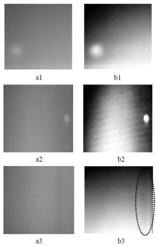 This research is focused on the automatic visual inspection on low-contrast surface micro defects of LCDs [3,4,5]. Figure 1 illustrates the brightness non-uniformity defects on the low-contrast LCD surface. The left section (a1–a3) depicts the defects, while the right section (b1–b3) shows the enhanced effects of these defects. It is evident that the surrounding areas of these defects possess low-contrast characteristics, making it challenging to identify these brightness non-uniform defects.