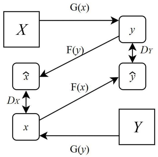 As shown in Figure 2, the CycleGAN model maps from the X domain to the Y domain by mapping G. DY is the discriminator corresponding to the generator, which is used to distinguish between real data and generate G(x), forming a single-generation adversarial process. In order to avoid invalid conversion effects, the authors of the CycleGAN model propose cyclic consistency loss. Another mapping relationship F maps from the Y domain to the X domain, and the discriminator of the denoted generator is DX, which distinguishes the real data and generates F(y). The CycleGAN model learns both the G mapping and F mapping relationships, while satisfying the cyclic consensus requirement: G(F(x)) ≈ x; after two opposite mappings, it returns from the x domain back to the x domain.