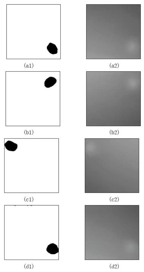 Segmentation results corresponding to defect images (a1–d1); and defective sample (a2–d2). The segmentation results were obtained by simple image processing and binarization of the defective image.