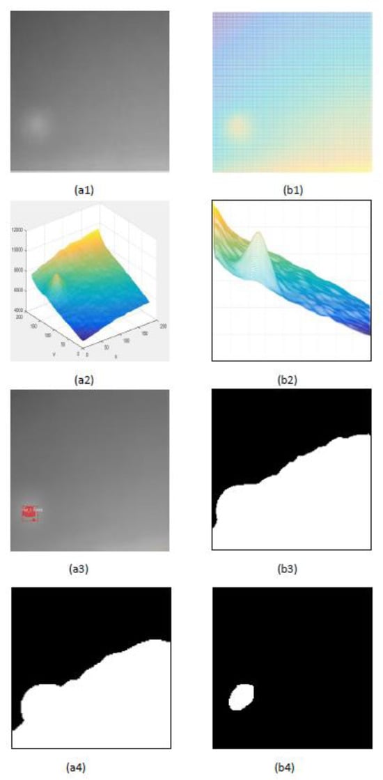 (a1,b1) Visualization of the defect surface image alongside its corresponding colored gray value display; (a2,b2) three-dimensional representation depicting the grayscale values within the defect image (a3); detection results obtained using our proposed Mask R-CNN method (b3); detection outcomes achieved through the Gabor method (a4); and detection results generated by the wavelet method (b4). Detection outcomes obtained using the U-Net method.