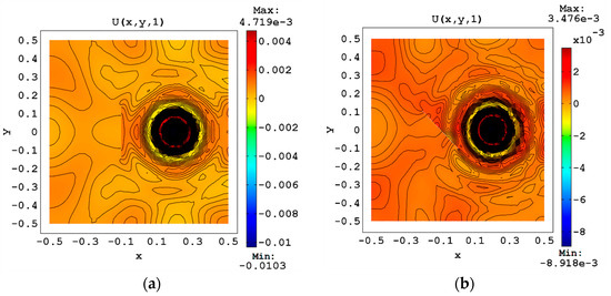 Comparison of the signal that passes through the crack: (a) a vertical position of cracks (5); (b) an angular (45°) position of cracks (8) (time in milliseconds, x in micrometers, U in micrometers).